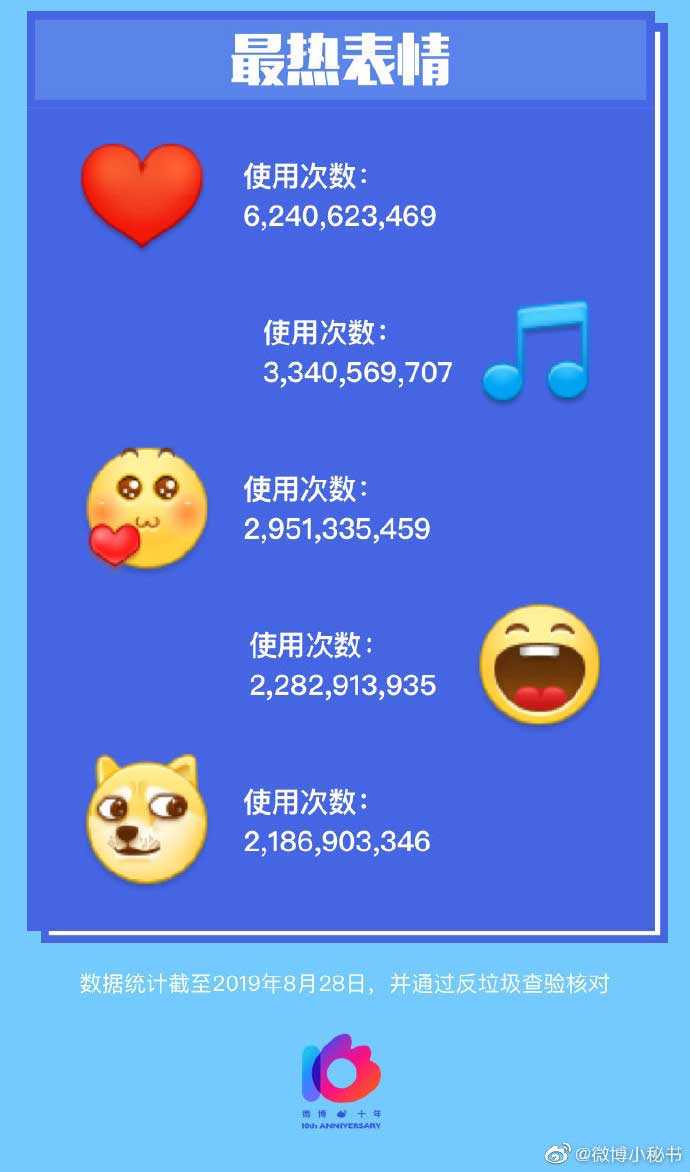 2009年8月,新浪微博经过内测后上线,2014年,新浪微博正式更名为微博,并于同年在纳斯纳克上市,前不久,微博刚刚走过了十个年头。9月2日上午,微博小秘书官微公布了微博十年使用次数最多的表情,其中“心”使用次数超62亿,成为最热表情。