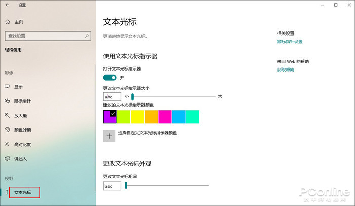 文本光标是之前“鼠标指针”的升级,提供了更多更丰富的光标选项。你可以任意修改光标指示器的粗细,调整光标指示器的颜色,甚至决定是否启用光标指示器。