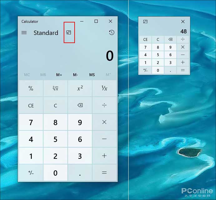 和记事本一样,计算器在这个版本中也开始以独立应用的身份存在。其中最明显一个变化,就是主面板中新增加的一键缩放按钮。它的作用是当你点击后任意缩小计算器,放置到任何你想放置的地方,而且……是在平板模式下!