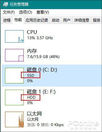 如果你的电脑同时安装了SSD和机械硬盘,那么就可以在“任务管理器”→“性能”→“磁盘”中看到当前磁盘的类型标记。不过这项特性目前仅限于任务管理器,包括资源监视器在内的其他工具并没有得到更新。