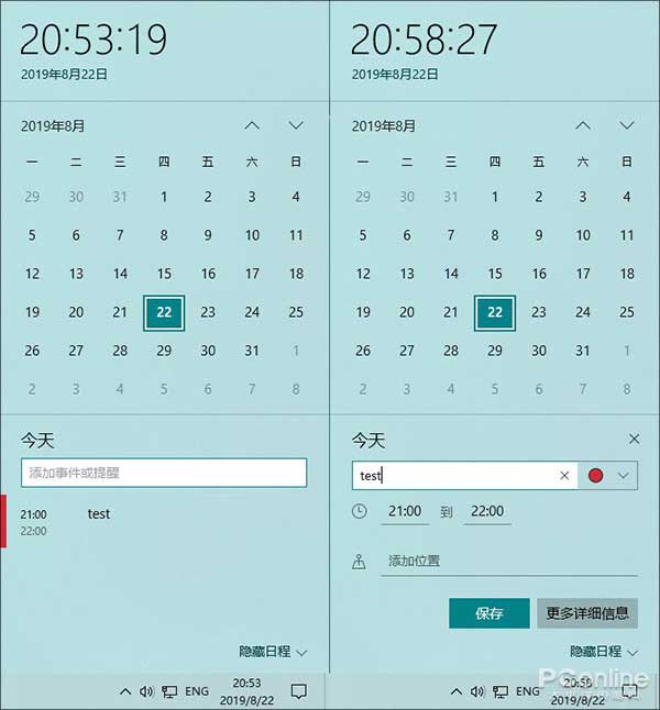 新版日历增加了一项小功能,允许用户直接在快捷面板上添加日程。和标准添加一样,输入事件后,我们也能为日程添加起止时间、事件位置,或者通过“更多详细信息”再次跳转完整版日历。
